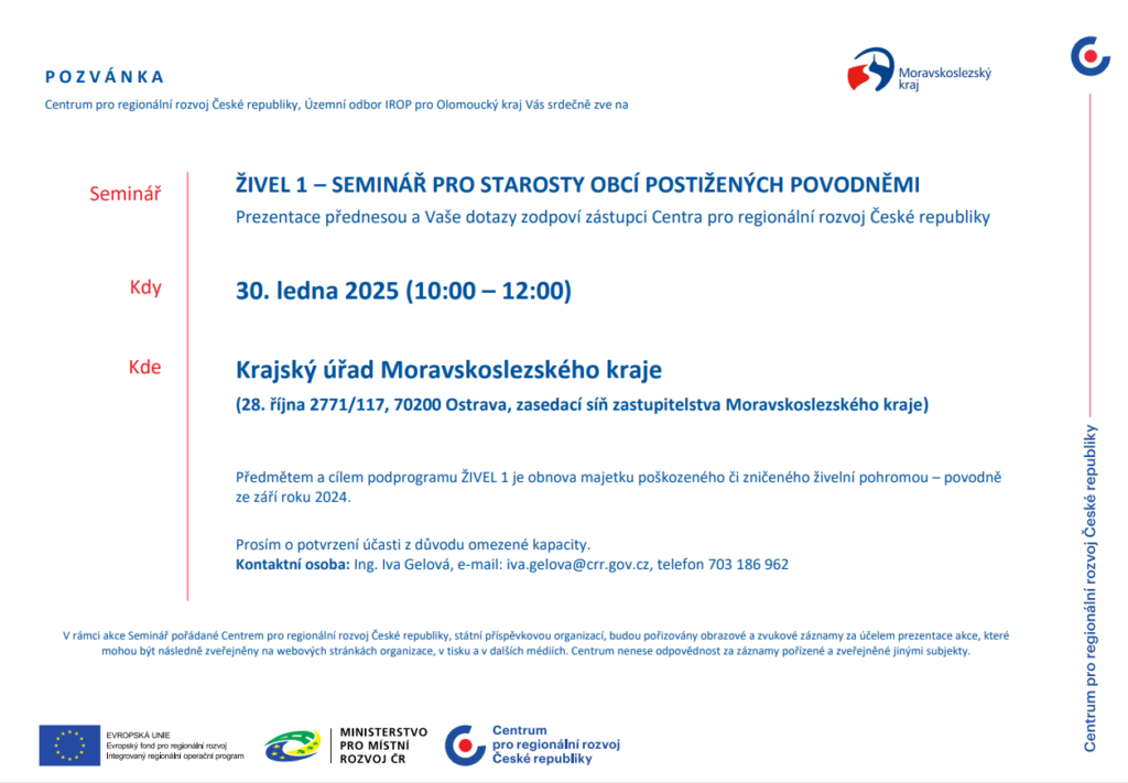 Dovolujeme si Vás pozvat na seminář pro starosty obcí postižených povodněmi, který se bude konat dne 30. ledna 2025 od 10 do 12 hodin v zasedací síni zastupitelstva Moravskoslezského kraje v budově Krajského úřadu Moravskoslezského kraje, na adrese 28. října 2771/117, 70200 Ostrava.